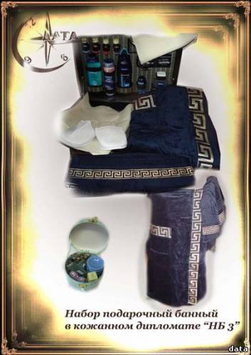1. Полотенце 2. Шапка 3. Варежка 4. Коврик 5. Тапочки 6. Масло 7.Шампунь 8. Гель д/душа 9. Пена д/бритья 10. Бальзам после бритья 11. Дезодорант 12.Станок д/ бритья 13.Повязка-килт/махров./ В пластиковом дипломате |